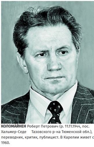 Роберт Петрович Коломайнен (г.р. 1944) – переводчик, литературный критик, публицист. В 1992 – 2014 годах – главный редактор литературного журнала «Carelia», издающегося в Петрозаводске.