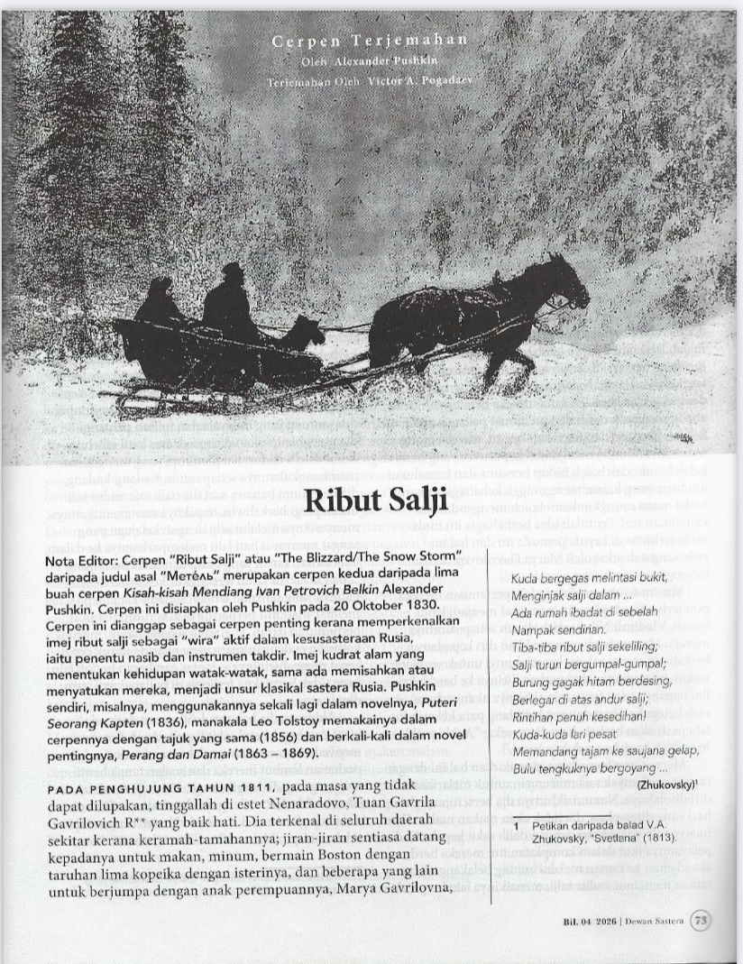 В апрельском номере малайзийского литературного журнала “Dewan Sastera” опубликован рассказ А. С. Пушкина «Метель» в переводе на малайский язык нашего автора доцента кафедры восточных языков Дипакадемии МГИМО МИД РФ В. А. Погадаева. Это не первое произведение русского писателя, переведенное В. А. Погадаевым. Изданная Советом по языку и литературе Малайзии в 2022 г. его монография «Великий русский поэт Пушкин и мир Востока» (Penyair Agung Rusia dan dunia Timur) включает переводы нескольких стихотворений поэта, рассказов «Барышня-крестьянка» и «Выстрел», а также «Сказку о рыбаке и рыбке» и «Сказку о царе Салтане».