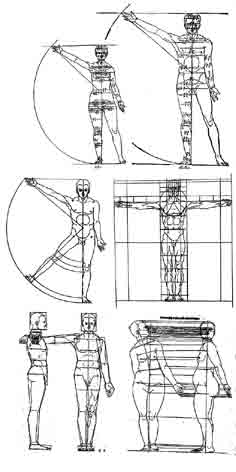 из художников Возрождения не оставил столько натурных и столько математических штудий человека: всю жизнь он разрывался между кистью и циркулем. ⌠Раздираемый противоречивыми стремлениями, он, с одной стороны, точно следует за натурой, с другой √ пытается создать стоящий выше повседневности идеал■. С одной стороны, его влечет ⌠сама природа■ и, прежде всего, выразительная сила и красота человеческого тела. С другой стороны, он строит чисто оптический образ этого тела с применением механизированной перспективы. И этот натуралистический образ он вписывает √ посредством неустанных измерений √ в идеальные формы геометрии.