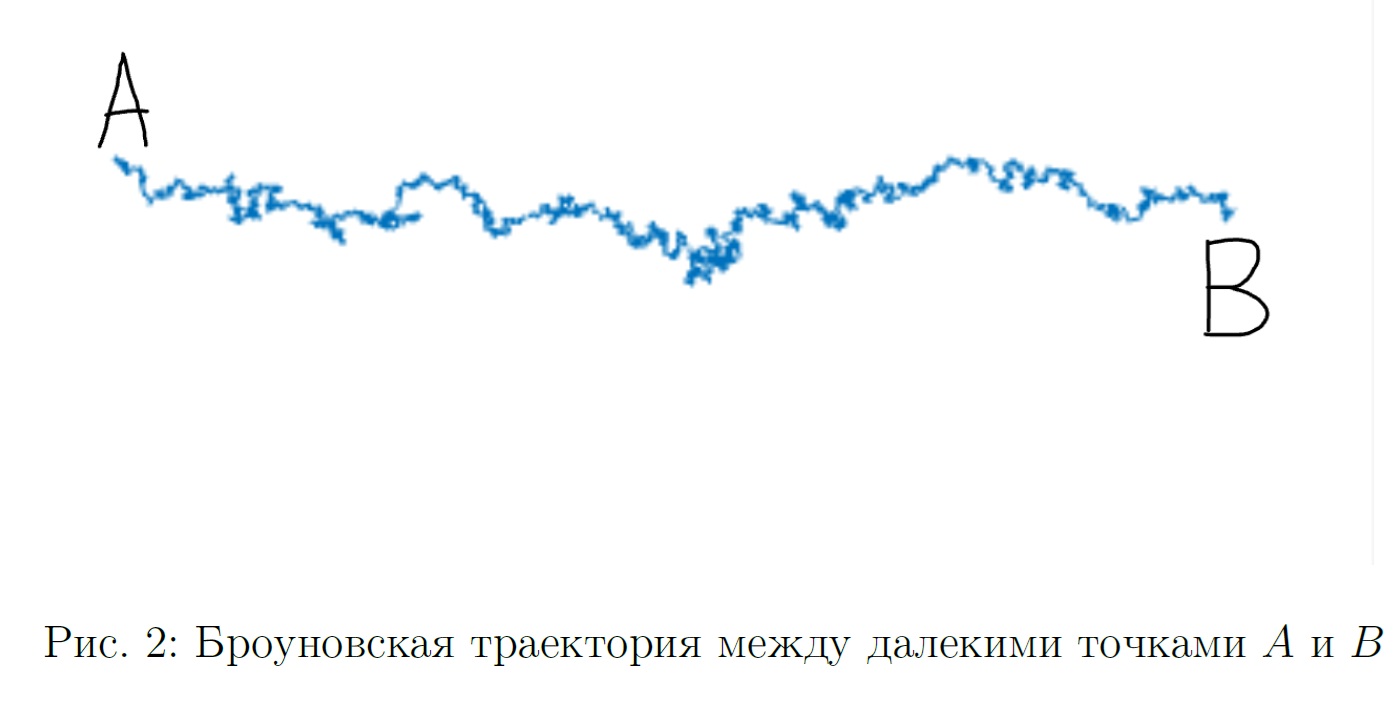 И вот теперь допустим, что за какое-то большое число n секунд частица переместится на расстояние порядка этого самого n. Вероятность этого, конечно, чудовищно мала, но тем не менее, строго говоря, она не равна нулю. И поэтому мы можем задать вопрос: каковы свойства траектории Броуновской частицы, если она случайным образом переместилась за n секунд на расстояние порядка n? Это типичный вопрос в теории больших уклонений, или в теории маловероятных событий. Если маловероятное событие происходит, как оно выглядит, есть ли в нем что-нибудь особенное? И вот совершенно замечательный ответ в данном случае: если в начале частичка была в точке A, а через n секунд оказалась в точке B, то она будет двигаться, с большой точностью, по прямой соединяющей A и B, с постоянной скоростью! Все остальные варианты ее движения, например чтобы она двигалась не по прямой, а по какой-то кривой, по ломанной, по окружности между A и B, имеют ещё неизмеримо меньшую вероятность. Значит, при условии что частичка попадает из точки A в точку B за n секунд, а расстояние между A и B порядка n, траектория, с вероятностью крайне близкой к 1, будет близка (я бы сказал, она может случайно отклоняться, но мало), просто к прямолинейному равномерному движению между точками A и B. Что это значит?