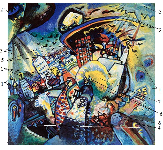 Кандинский. Москва 1. 1916. "Эта небольшая по размеру картина полна глубокой символики. Мастер… показывает… обобщающий образ древней столицы с ее церквями [1]. По всей видимости, здесь представлен миг обновления, и вверху по углам картины показаны некоторые сгустки энергии [2], испускающие магические лучи [3]. Реальность преображается. Сами собой раскрываются захоронения [4], черные птицы взмывают в воздух [5]. В центре композиции видна пара [6], которая вступает в некое оранжевое облако [7]. Она, несомненно, переходит в иное пространство, в иные миры. Привлекает внимание аббревиатура, состоящая из двух букв “АН”, сливающихся в некий знак. Можно предположить, что это инициалы его будущей жены Нины Андриевской (но они в действительности познакомятся чуть позже). Если же предположить, что буквы — это сокращение немецкой записи “Heilige Anna” [8] (то есть “Святая Анна”), то тогда картина посвящена первой жене художника Анне. Художник, разведясь с ней, никогда не порывал отношений, перешедших в дружеские, и они вновь свиделись в Москве. На какое-то время для него Анна стала символом Москвы. Само же поклонение женщине проходит через все творчество Кандинского, и многих из них он называл “святыми”, веря в их высокое предназначение. Так что картина — икона любви, пусть и прошедшей. Именно эти двое, художник и Анна, находящиеся в центре картины, переходят в иной, высший мир” (Турчин. https://art.1sept.ru/article.php?ID=201000107). Так описать – это вести разговор на уровне ЧТО изображено. Даже не на эстетском уровне КАК. Тем паче не на уровне ЗАЧЕМ ТАК (чем что выражено, что есть или граничит с упрёком художнику в иллюстративности и есть позор для неприкладного искусства). И уж совсем не на уровне озарения насчёт ЧТО-ТО, словами невыразимое, на которое, будучи искусствоведом дан словесный намёк, можно считать, что дан единственно достойный способ анализа странностей произведения и синтеза из того анализа художественного смысла целого. Я уж не говорю о сомнительности со “святыми”. Со святыми так не поступают. Первую жену, державшую его в ежовых рукавицах бросил, не развёлся и уехал, любовницу марудил 12 лет и тоже бросил и 4 года даже не объявлялся, второй раз женился, будучи старше новой жены на 33 года. Есть и передёрг: "Он стремился понять духовное сердце России, о которой взволнованно писал в своей книге “Ступени. Текст художника” (ее русский вариант под этим названием появился в 1918 г.” (Турчин). Намёк, что от 2016 до 2018 немного времени. На самом деле: "Первый, немецкий, вариант книги (Kandinsky: 1901-1913. Berlin: Der Sturm, 1913. S. III-XXIX) имеет заглавие "Rьckblicke" ("Воспоминания", или "Взгляд назад")” (http://www.kandinsky-art.ru/library/isbrannie-trudy-po-teorii-iskusstva53.html). Назад. О себе, и близко не ставшем ещё абстракционистом. О юном. Ещё не погрузившемся в сухомятку юриспруденции, ещё не попавшем под каблук жены, ещё позитивно мечтательном: "…тем часом, который был и будет самым чудесным часом московского дня. Солнце уже низко и достигло той своей высшей силы, к которой оно стремилось весь день, которой оно весь день ожидало. Не долго продолжается эта картина: еще несколько минут, и солнечный свет становится красноватым от напряжения, все краснее, сначала холодного красного тона, а потом все теплее. Солнце плавит всю Москву в один кусок, звучащий как туба, сильной рукой потрясающий всю душу. Нет, не это красное единство — лучший московск