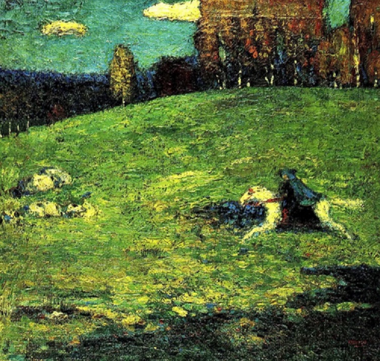Кандинский. Синий всадник. 1903. русским искусствоведам не нужно себя насиловать, и они возвышаются (относительно принципов ЧТО, КАК и ЗАЧЕМ ТАК) до намёков на давно расшифрованное романтическое ЧТО-ТО, словами невыразимое: идеал прекрасной внутренней жизни, куда надо бежать от ужасной внешней (хоть Кандинский и выступает всего лишь эпигоном романтизма). "Осенний пейзаж, окрашенный золотом листвы и почвы… Пейзаж, всё пространство, которое пересекает скачущий всадник, приобретает визионерский характер, наполняется мистическим содержанием. Ржавые рыжие цвета деревьев и травы, неведомо откуда взявшиеся густые синие, окрашивающие дальний лес и тень всадника, какая-то “нездешняя” лазурь небес, словно увиденная сквозь цветное стекло” – всё это “поправки” к традиционной импрессионистически-декоративной системе безусловно вызваны присутствием романтического героя, озаряющего пейзаж безудержным бегом своего коня к неведомой цели” (Сарабьянов. Автономова. “Василий Кандинский”. https://www.prlib.ru/item/322849 ). Восторг! ЧТО: романтический герой с безудержным бегом к неведомой цели. КАК: лазурь небес, словно увиденная сквозь цветное стекло, густые синие. ЗАЧЕМ ТАК: “нездешняя”, пространство приобретает визионерский характер, неведомо откуда взявшиеся... ЧТО-ТО: с мистическим содержанием – прекрасная внутренняя жизнь души, в пику ужасной внешней, материальной. А как только речь заходит об абстрактных и полуабстрактных картинах, так у тех же авторов крылья опадают.
