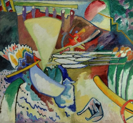 Кандинский. Импровизация 11. 1910. "…кроме собаки, которая в контексте ассоциаций оказывается особенно неожиданной, в картине мы находим множество предметов и мотивов: и лодку под парусом с гребцом и другими фигурами, и пушки, направленные в противоположные стороны, и красное облако, исторгающее молнию, и ряд других фигур с ружьями или секирами, и воинов с обнажёнными саблями, и виселицу с фигурами повешенных на ней людей… и воду, и сушу, и небо… в этой компании все её элементы объединены общим пространством, отчего возникает полная необъяснимость сопоставлений и появляется, с другой стороны, желание связать элементы в единый нарративный организм. Обнажается сюжетный алогизм, который усиливается оттого, что сами предметы вполне узнаваемы. Кандинский оказывается во власти того принципа сюжетообразования, который характерен для мифа. Он играет пространством и временем, у него – своя логика события, которая может оказаться произволом, но на самом деле имеет свои законы” (Там же). Так просто ж враньё про миф. Разве те, которые мы помним, не логичны? Разве не вседозволенность завистливо со стороны людей выражена, например, в преображениях греческих богов во всяких животных для цели изнасилования разных женщин? В гомеровском эпосе, я знаю, античный подсознательный идеал метафизического иномирия прорывался в странности, заключающейся в каком-то неуловимом однообразии/разнообразии ритма гекзаметра, и он уносил слушателей вон из обыденности жизни, жизни, наверно, не менее гнетущей, чем в начале ХХ века в преддверии страшнейшей войны и революции, как это, наверное, чувствовалось Кандинским. Этот страх намечен номенклатурой того, что выбранно Кандинским для изонамёка: кусачая собака, тяготы гребли, противоборствующие пушки, убивающая молния и люди с оружием, виселица. – “Вон, в абсурд иномирия от этого ужаса!” - как бы кричит подсознательный идеал Кандинского, кричит самою этой еле узнаваемостью предметов. Если б его восторгало собственное чутьё, способность предсказать, он был бы реалистом и не изобрёл бы образ иномирия в виде Абсурда. Но он был разочарованнейшим человеком. Если он не умер от этого рано, как это случилось со многими ницшеанцами, так, наверно, из-за, опять же, внутренней отстранённости от этого скучнейшего мира (как мало похожи на себя полуизображённые им предметы). Пошлое недоницшеанство в виде вседозволенности в Этом мире было не для него, а для презираемой им толпы. Как и с Гомером, наверно, было, в пику его слушателям. Наверно, и “Москву 1” тоже можно интерпретировать как издевательство Кандинского над собой молодым, склонным тогда в Москве к символизму. И эта его “Святая Анна”, оказавшаяся деспотом в юбке, и эти духоподъёмные места Москвы, с мощами в кремлёвских церквах, и кризис религии несмотря на обилие церквей, кризис вызвавший аж реакцию-потугу религиозного возрождения, провалившегося. Смешано всё святое в хаос, который есть образ предвзрыва, предполагающего взрыв такой силы, что он зрителя швырнёт в иномирие. Самая русскость, символизируемая Москвой, для того и взята темой, чтоб оскорбить самое дорогое. Довести зрителя до предвзрыва, - как Чехов доводил скучностью читателя, - чтоб представился тот благой взрыв. Но, чтоб ТАК толковать Кандинского, нужно быть вооружённым таким теоретическим допущением в науку и