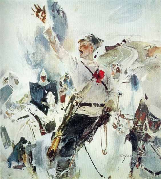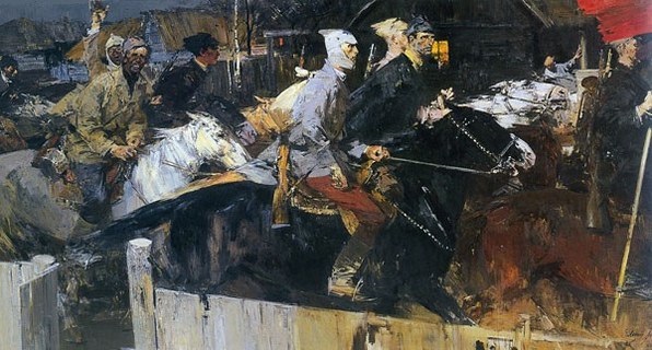 Что за краснота в самом углу? Это обтрепавшееся в боях красное знамя успело попасть в кадр или багровое небо от пожарищ, сопровождающих наступление красных? Почему на первом плане забор? Это прямо противоположно воспоминанию художника про дела сорокалетней давности (он родился в 1916-м, ему в 1921-м, ближе к концу гражданской войны, было уже 5 лет): "В детстве поразили красные конники, словно луч из далекого светлого мира ворвался в наши довольно глухие места <...> Стоя за дощатым забором, я с восторгом смотрел на проносившихся мимо меня всадников-красноармейцев на взмыленных конях, они мне казались гигантами” (https://rusmuseumvrm.ru/data/collections/painting/19_20/zh-8470/index.php). По-моему, многозначительно это отсутствие встречающих Красную Армию селян. И я не знаю, насколько можно верить словам художника (если это со слов художника Кривенко написал), что "В ходе работы над холстом автор первоначально поместил у открытой калитки, на переднем плане, девушку, приветствующую красных воинов. Но вскоре художник убедился, что эта фигура придает некоторую многословность композиции, лишает зрителя активности и убрал эту превосходно написанную фигуру” - Кривенко, И. А."Е. Е. Моисеенко. “Красные пришли” // Замечательные полотна. Л., Художник РСФСР, 1964. С. 399—400 (Википедия). С точки зрения зреющей антисоветскости (которую никто не замечал никогда!) можно кое-что заметить у того же Кривенко о первом варианте картины (я не смог найти её репродукцию): "...Яркое полуденное солнце залило белорусское село [Во втором варианте – гляньте на левый верхний угол картины – перед нами ночь, лунная, раз прорывающийся лунный свет выхватывает фигуры двух красноармейцев и их белых коней]. На пыльной улице остановилась на короткий привал красная конница. Спешившийся боец жадно пьет воду прямо из крынки [то, что через 8 лет, в “Комиссаре”, превратилось в вишни]. Перед ним женщина с торопливо наброшенным на голову платком. Она в каком-то оцепенении [Почему? Не потому ли, что не знает, как себя вести? Эх, яблочко, цвета ясного! Справа белого бей, слева красного]. Рядом с ней мальчишка в буденовке, в старом, оставшемся, очевидно, от отца поношенном френче, спускающемся до колен, он во все глаза смотрит на бойца. А кругом бойцы, крестьяне, тачанки, лошади, они образуют живописные группы. Таким был первый вариант картины “Красные пришли” Е. Е. Моисеенко” (http://painting.artyx.ru/books/item/f00/s00/z0000010/st065.shtml). Я, может, и перегибаю. Красное знамя заслоняет верх будёновки красноармейца, держащего это знамя, а древко знамени чуть ли не земли кается. То есть красное – это не зарево пожара. Забор на переднем плане – Кривенко прав – формирует стремительность проезда конницы. Ночь не предполагает массовую радостную встречу проезда красных крестьянами, но какую-то всё же предполагает (один красноармеец машет рукой зрителю, а другой скалит вам зубы в улыбке). Но экспрессионистская чернота или, наоборот, белизна лиц живописно говорит об отчаянии в 1961 году. Что там было в СССР? "Реформы Хрущева обозлили народ. Что же так возмущало советскую провинцию? В первую очередь, безусловно, неумело проведенные – и явно популистские – реформы в аграрном секторе. Приравнивание колхозов к совхозам не только слегка улучшило жизнь задействованных в этой сфере людей, но и буквально взорвало выстроенную систему, внесло дисбаланс. Еще более сокрушительный у