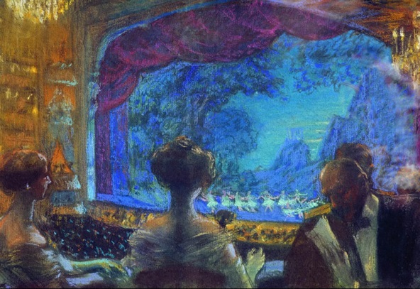 Для иллюстраций я б вообще предложил устроить музеи околоискусства. Об упоминавшейся картине-шедевре Рылова – см. тут и тут. А о кустодиевской “В ложе” 1912 года я не писал – может, удастся что-то толковое написать, раз я о его вещах много чего написал когда-то.