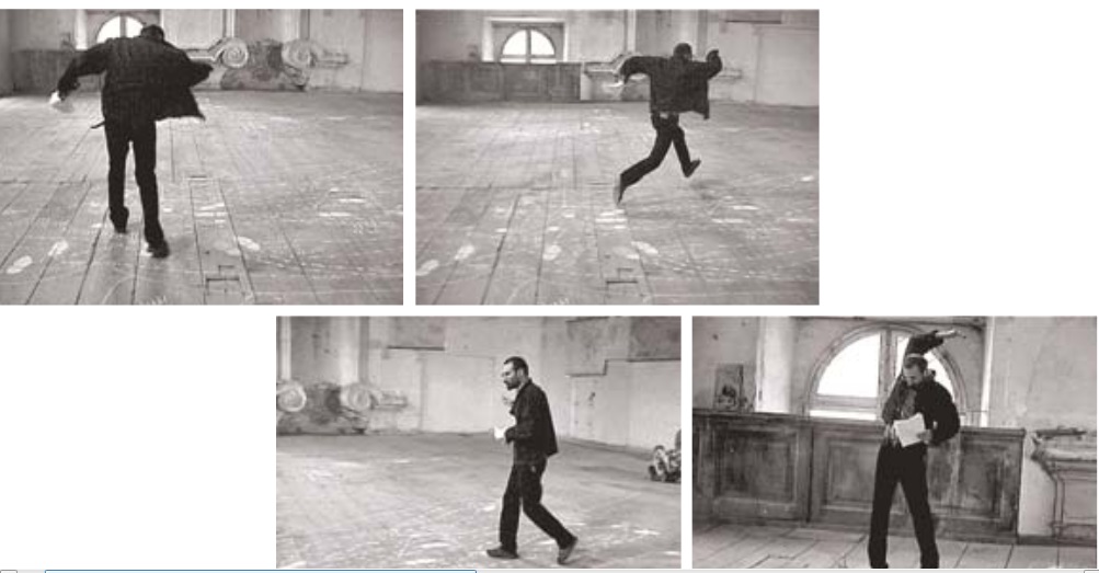 А другою, отсутствующею, странностью (тем и странной, что отсутствует), естественно окажется что-то интересное. И обе имеют место быть на Этом свете. Обе странности, сталкиваясь в душе восприемника, доведут его как бы до предвзрыва, взрыв при этом мыслится такой силы, что вышвырнет восприемника вон из вообще Этого мира – в метафизичечское иномирие. "Видимо, концептуализм сложно загнать в какие-либо рамки, потому что он всегда убегает от самого себя, тем самым необъяснимо, вне всякой логики расширяя свои границы. Прекрасный тому пример – работы Юрия Лейдермана последних лет: Танцы убитых троянцев” (С. 7). Ну так это для неясно мыслящих авторов так, но не для меня. Поэтому, когда я вижу фото этого перформанса и читаю описание его самим Лейдерманом…