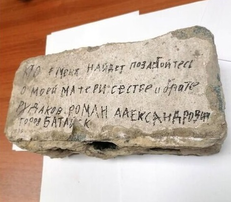 Кирпич из дома в Марьинке с последними словами Романа Рудакова. 2023. Без комментариев.