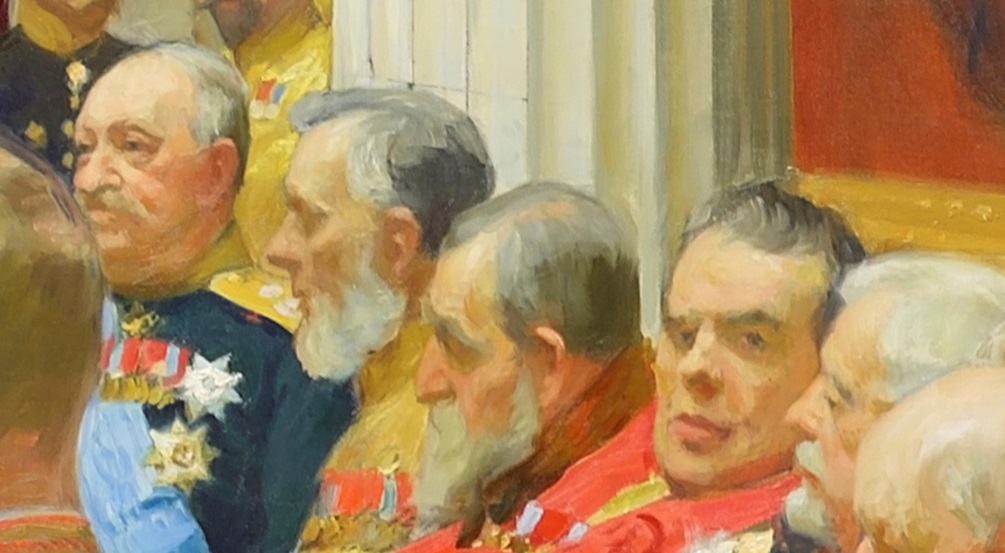 Близко к центру и к Николаю Второму сидит человек к нам в три четверти оборота, чуть не бросающийся в глаза тем, что другие около него сидят к нам профилями и затылками. Его, наверно, писал Репин.